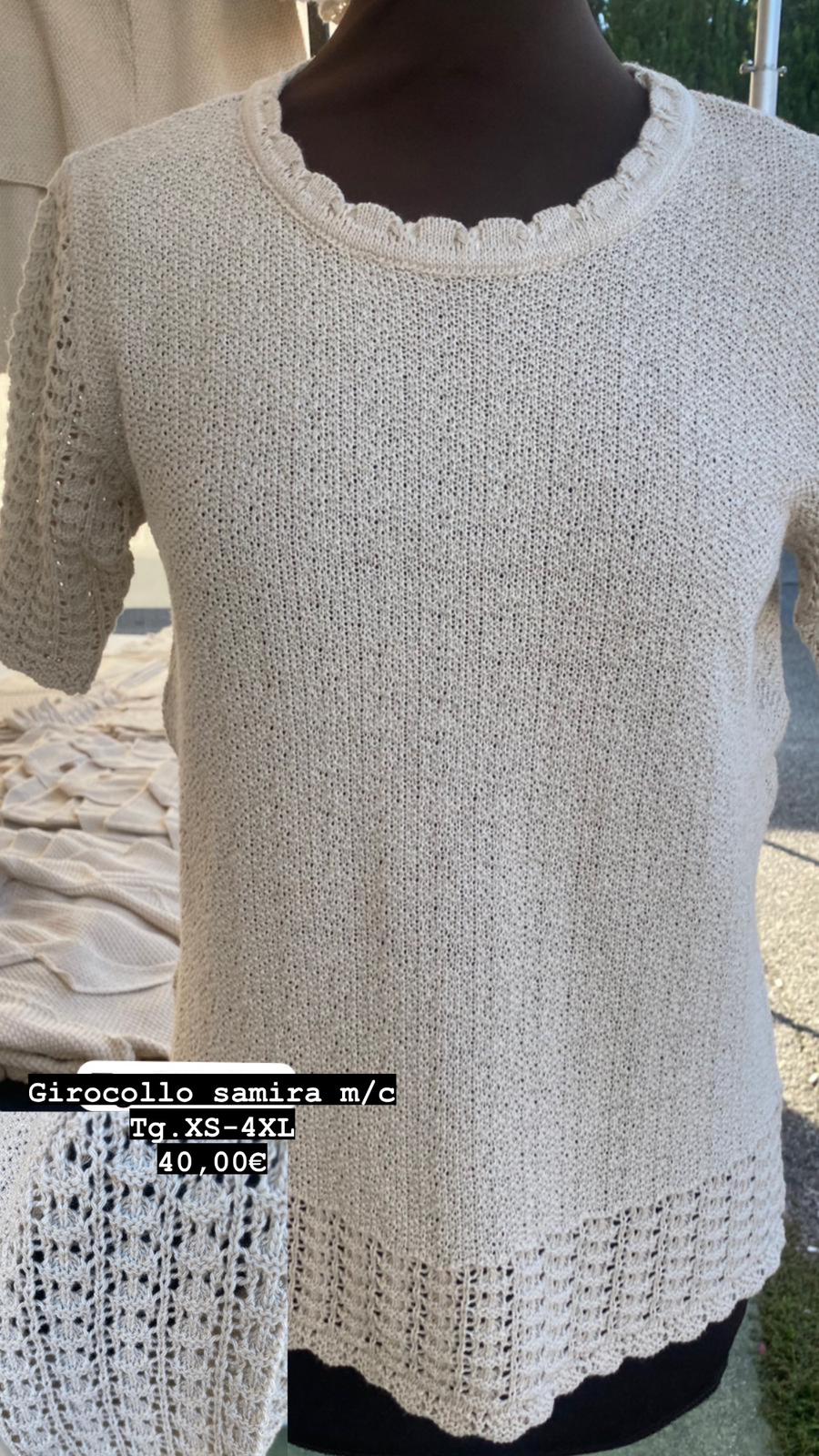 Maglia a maniche corte in puro cotone. Lavorazione traforata sul bordo inferiore e sulle maniche, tinta neutra.